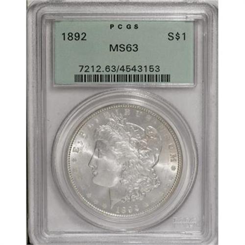 <B>1892 $1 MS63 PCGS.</B></I> . PCGS Population (1438/1384). NGC Census: (871/741). Mintage: 1,037,245. Numismedia Wsl. Price for NGC/PCGS coin in MS63: $350. (#7212)<BR><BR><B>Coin Engraver:</B> George T. Morgan<BR><BR><b>Shipping:</b> Coins & Currency (<a target="_blank" href="http://www.heritageauctions.com/common/shipping.php">view shipping information</a>)