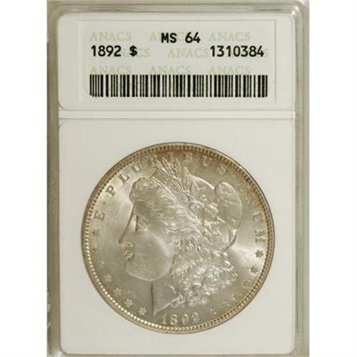 <B>1892 $1 MS64 ANACS.</B></I> Solidly defined overall with only a hint of softness at the uppermost part of the obverse. This pleasing P-mint near-Gem offers shining luster and a thin veil of peach-gold patina over the obverse and reverse margins.<BR><BR><B>Coin Engraver:</B> George T. Morgan<BR><BR><b>Shipping:</b> Coins & Currency (<a target="_blank" href="http://www.heritageauctions.com/common/shipping.php">view shipping information</a>)