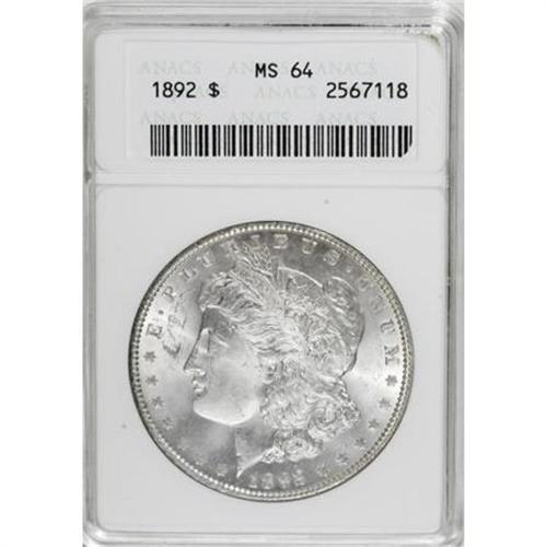 <B>1892 $1 MS64 ANACS.</B></I> This shining Choice P-mint issue has excellent luster and only a hint of highpoint softness. The faintly marked surfaces are minimally toned aside from a touch of haze. A lovely example from an issue of just over 1 million pieces.<BR><BR><B>Coin Engraver:</B> George T. Morgan<BR><BR><b>Shipping:</b> Coins & Currency (<a target="_blank" href="http://www.heritageauctions.com/common/shipping.php">view shipping information</a>)