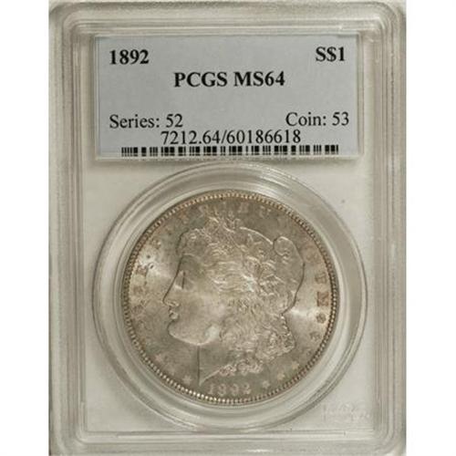 <B>1892 $1 MS64 PCGS.</B></I> The Philadelphia Mint produced fewer and fewer silver dollars as the early 1890s progressed, culminating in the famous "missing" mintage of 1895. In 1892, the total was slightly over 1 million pieces, coins such as this richly toned near-Gem. Well struck with strong luster beneath muted peach and plum colors. An abrasion is noted on the eagle's breast.<BR><BR><b>Shipping:</b> Coins & Currency (<a target="_blank" href="http://www.heritageauctions.com/common/shipping.php">view shipping information</a>)