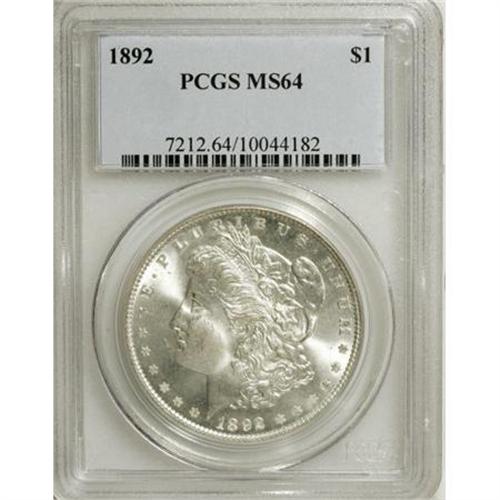 <B>1892 $1 MS64 PCGS.</B></I> Typically struck with thick satiny luster and minimal marks, particularly on the reverse. Several pinscratches and a few minor luster grazes occur in the left obverse field and on Liberty's face. An attractive and essentially untoned example of this relatively low-mintage date.<BR><BR><b>Shipping:</b> Coins & Currency (<a target="_blank" href="http://www.heritageauctions.com/common/shipping.php">view shipping information</a>)