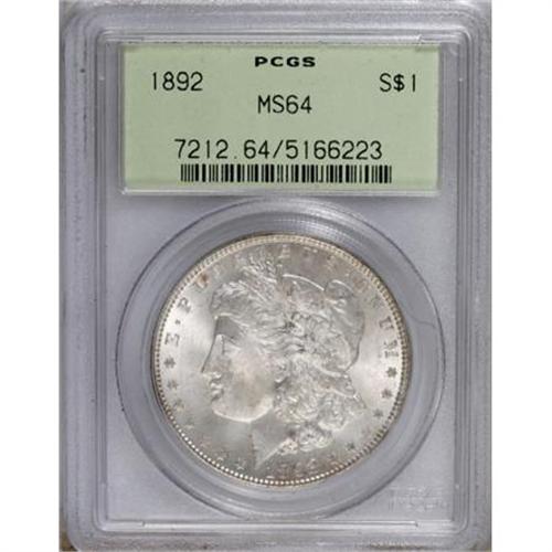 <B>1892 $1 MS64 PCGS.</B></I> VAM-3. The reverse legends are lightly die doubled, but of greater collector interest is the low mintage, which barely exceeds 1 million pieces. A lustrous near-Gem with clean fields and delicate tawny-gold toning. Certified in an old green label holder.<BR><BR><B>Coin Engraver:</B> George T. Morgan<BR><BR><b>Shipping:</b> Coins & Currency (<a target="_blank" href="http://www.heritageauctions.com/common/shipping.php">view shipping information</a>)