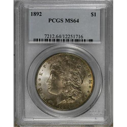 <B>1892 $1 MS64 PCGS.</B></I> Well-defined with soft, pleasing luster beneath rich patina. Olive, green-gold, and rose shadings predominate, though areas of silver-gray appear at the left obverse and the center reverse.<BR><BR><B>Coin Engraver:</B> George T. Morgan<BR><BR><b>Shipping:</b> Coins & Currency (<a target="_blank" href="http://www.heritageauctions.com/common/shipping.php">view shipping information</a>)