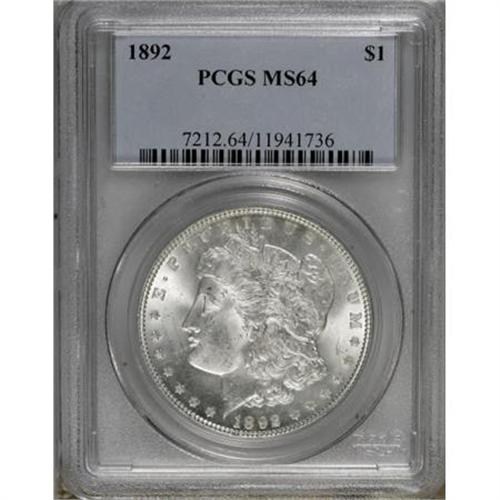 <B>1892 $1 MS64 PCGS.</B></I> Well struck for this Philadelphia issue with soft silver-blue patina over swirling luster. Though a few wispy marks appear on and near the portrait, the visual appeal is excellent for the Choice designation.<BR><BR><B>Coin Engraver:</B> George T. Morgan<BR><BR><b>Shipping:</b> Coins & Currency (<a target="_blank" href="http://www.heritageauctions.com/common/shipping.php">view shipping information</a>)
