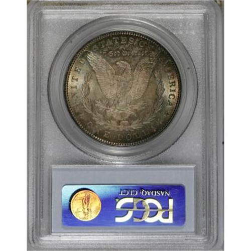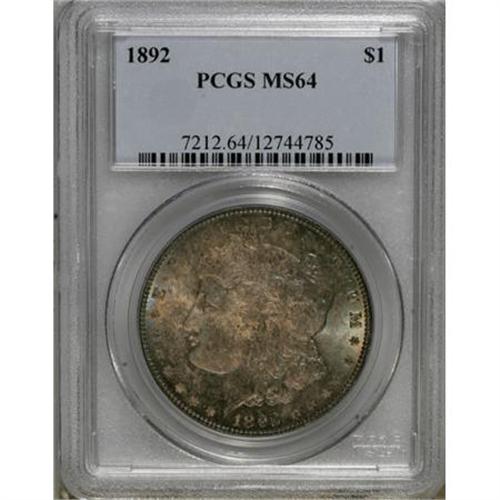 <B>1892 $1 MS64 PCGS.</B></I> The mottled reddish-gray and turquoise-green coloration over both sides is attractive and obviously original. Slight striking weakness is noted just above Liberty's ear, but the remaining design elements are crisply defined. A shallow scrape is noted just below and to the left of Liberty's chin, along with two or three slight nicks on her cheek and jaw. <BR><BR><B>Coin Engraver:</B> George T. Morgan<BR><BR><b>Shipping:</b> Coins & Currency (<a target="_blank" href="http://www.heritageauctions.com/common/shipping.php">view shipping information</a>)