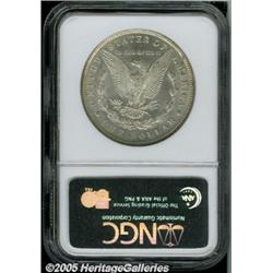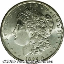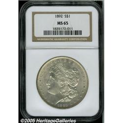 <B>1892<img border='0' src='http://www.heritagecoins.com/images/star.gif' width=10 height=10>$1 MS65 NGC.</B></I> This is a sharply struck Gem with exceptional luster and soft, frosty surfaces. It is a decidedly elusive date in Gem quality, and NGC has only certified one finer example of the issue. Population: 80 in 65, 1 finer (2/05).