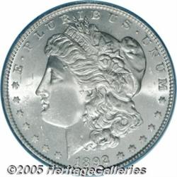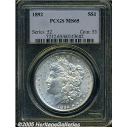 <B>1892<img border='0' src='http://www.heritagecoins.com/images/star.gif' width=10 height=10>$1 MS65 PCGS.</B></I> Nearly all surviving 1892 Morgan Silver Dollars, if they are even Mint State, are at the low end of the grade spectrum. As striking quality can vary widely, it is recommended that you bid on this example, which is very sharply defined. In fact, this Gem is very nearly fully struck and has frosty silver luster. This is also nearly the finest available quality, with only one finer example ever certified by PCGS. Population: 159 in 65, 1 finer (2/05).