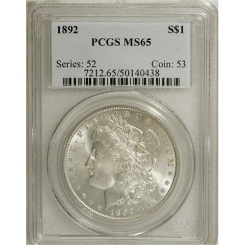 <B>1892 $1 MS65 PCGS.</B></I> The 1892 dollar is generally obtainable through the lower grades of Mint State, but Gem quality examples are scarce. Vibrant luster graces the untoned, well cared for surfaces of this MS65 piece, and the design features are well brought up, including the feather detail on the eagle's breast. PCGS has seen only two coins finer, and NGC a mere one in higher grade (7/07).<BR><I>From The Arnold & Harriet Collection, Part Two.</B></I><BR><BR><B>Coin Engraver:</B> George T. Morgan<BR><BR><b>Shipping:</b> Coins & Currency (<a target="_blank" href="http://www.heritageauctions.com/common/shipping.php">view shipping information</a>)
