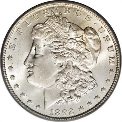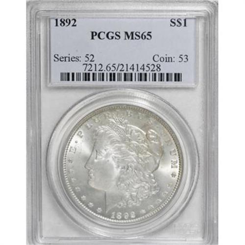 <B>1892 $1 MS65 PCGS.</B></I> A few minuscule obverse marks keep this from a higher grade. Both sides have brilliant and frosty silver luster with sharp design features. Mostly untoned, although faint splashes of light gold are evident on each side. Just two finer examples of this date are currently PCGS certified (1/08).<BR><I>From The Jimmy G. PCGS Registry Collection of Morgan Dollars with Varieties.</B></I><BR><BR><B>Coin Engraver:</B> George T. Morgan<BR><BR><b>Shipping:</b> Coins & Currency (<a target="_blank" href="http://www.heritageauctions.com/common/shipping.php">view shipping information</a>)