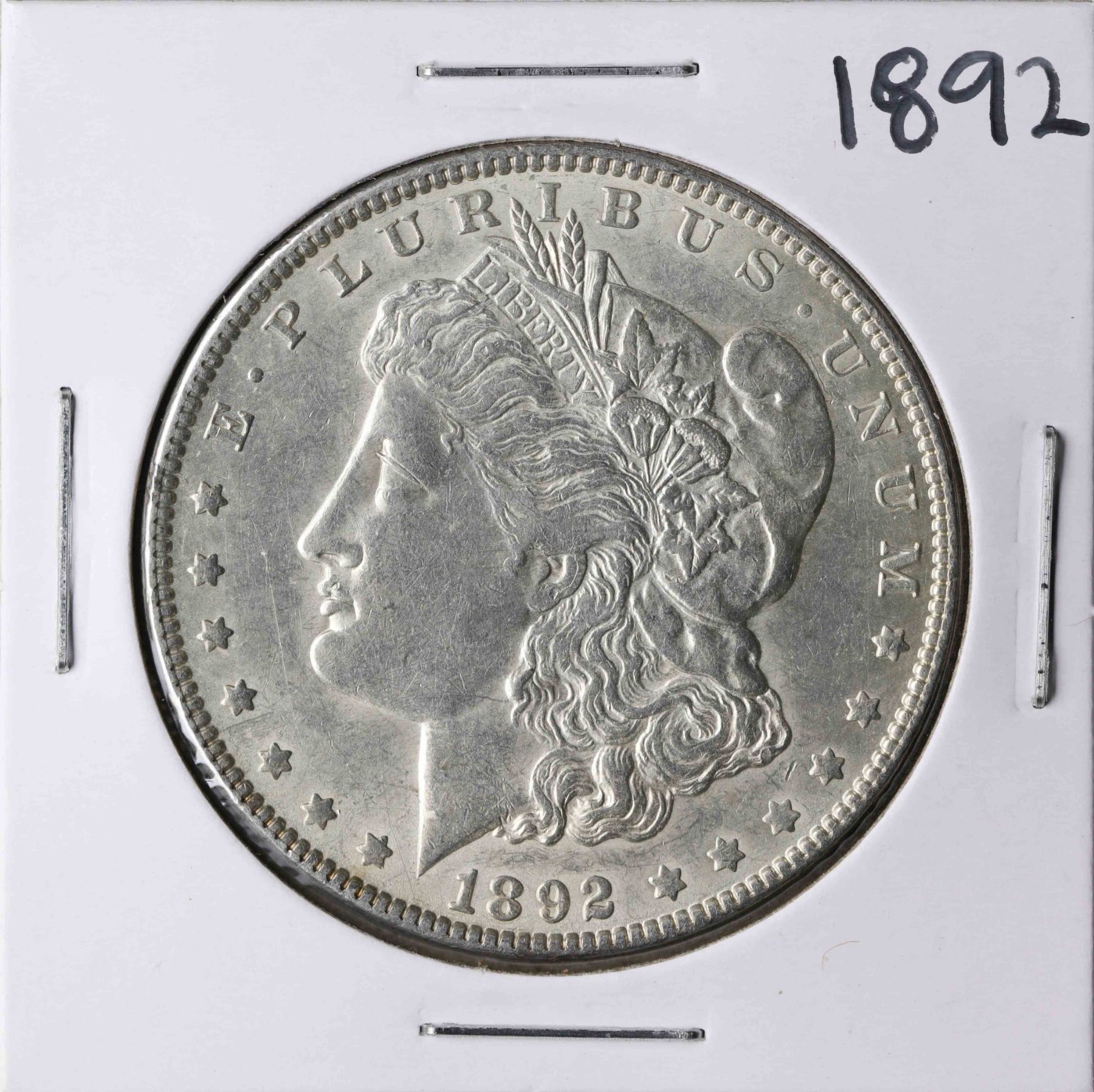 One 1892 $1 Morgan Silver Dollar Coin.