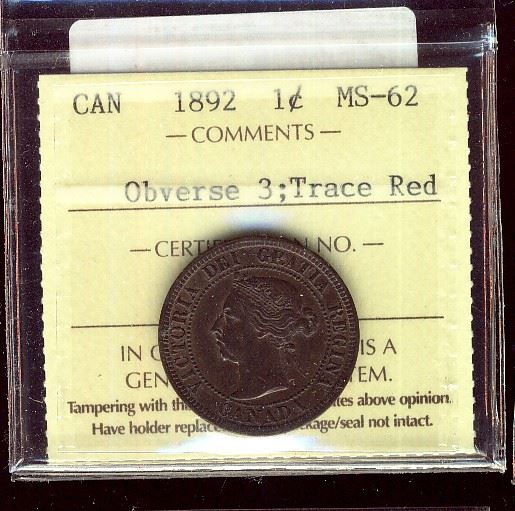 1892 1¢ Obv 3 ICCS MS62 Trace Red.