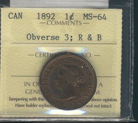 1892 1¢ Obv 3 ICCS MS64RB. Lustrous.