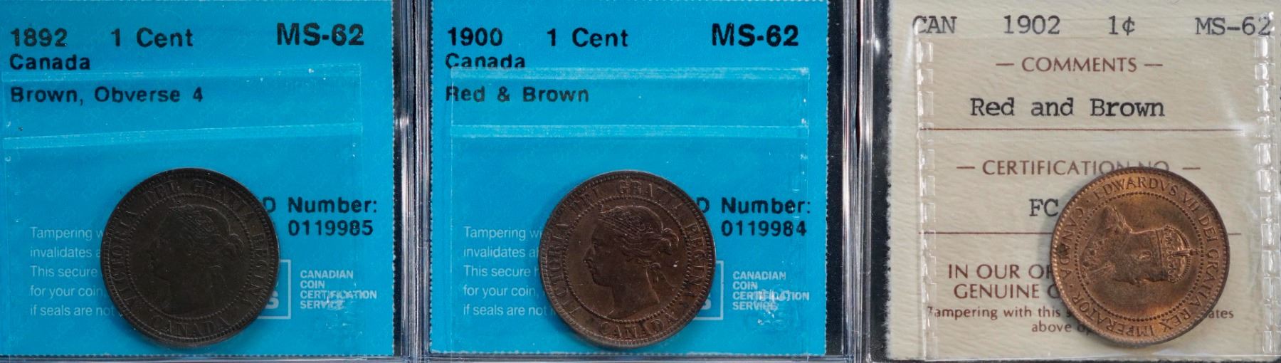 1892 1¢ Obv 4 BR, 1900 RB, 1902 RB, all CCCS/ICCS Choice Mint State-62, lot of 3 coins.