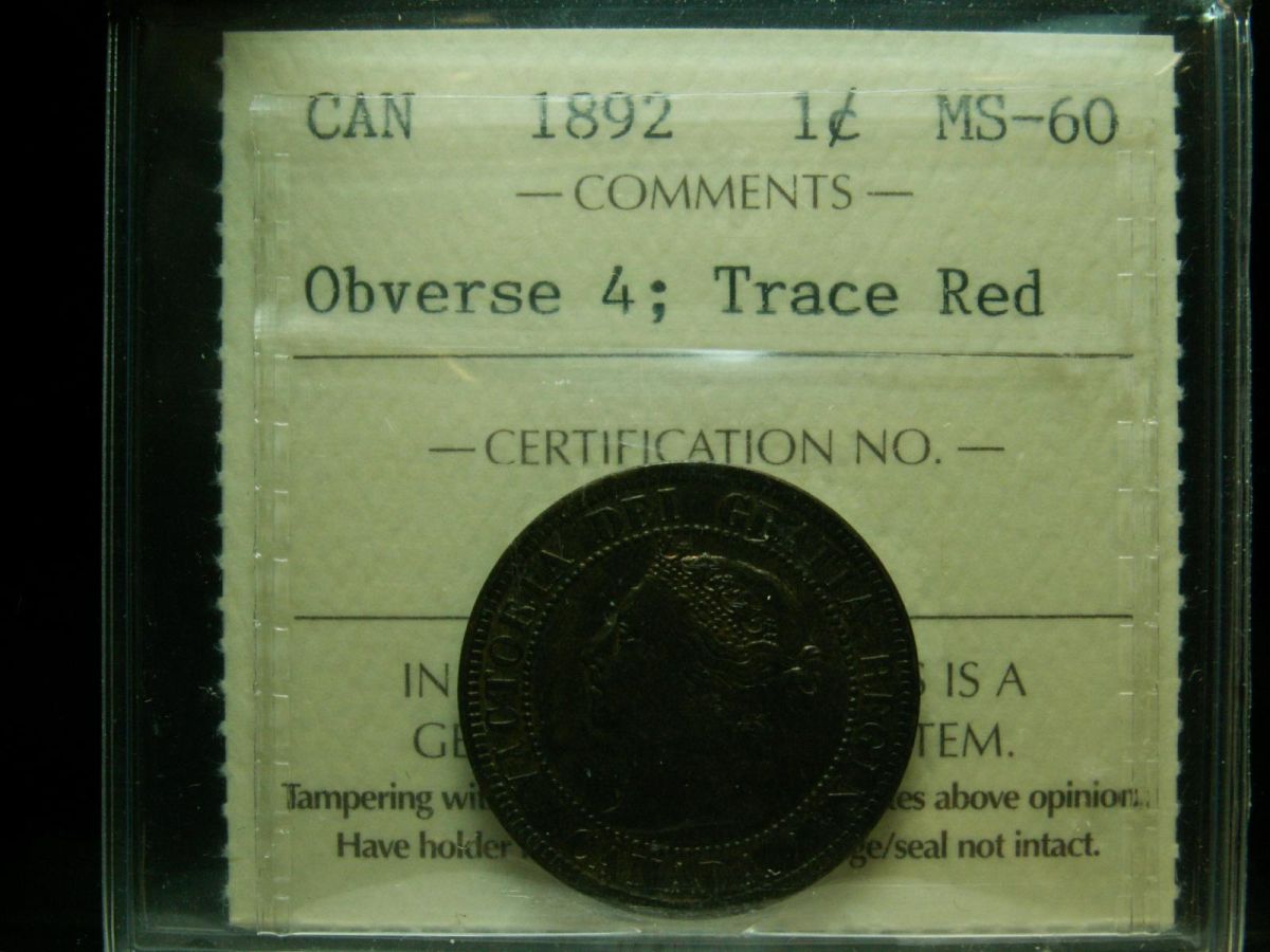 1892 1¢ Obv 4 ICCS MS60 Trace Red