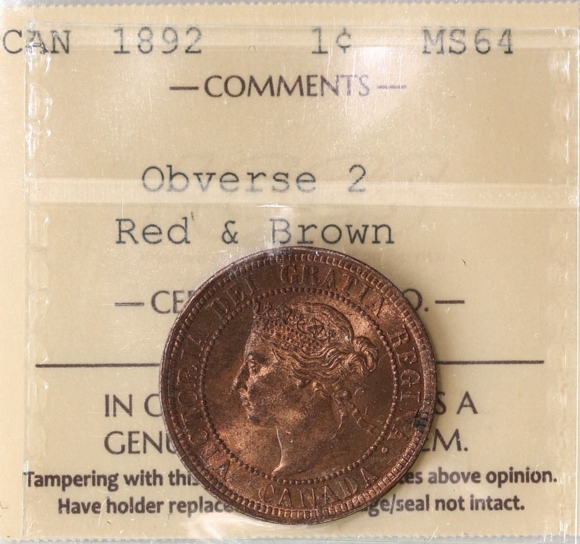 1892 1¢ "Obverse 2" ICCS Very Choice Mint State-64 RB. 85% red lustre with great surfaces and Proof-Like finish. Important key obverse in this series and extremely scarce in this high grade. A superb issue to add to your collection. A previous example brought in $3585 at the 2023 RCNA sale. This is a far superior example. Worth a premium bid.