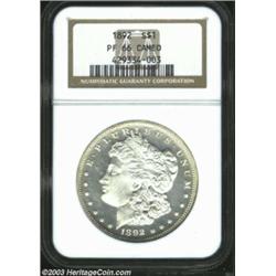 <TABLE cellSpacing=0 cellPadding=0 width="100%" bgColor=#000000 border=0><TBODY><TR><TD width="100%"><TABLE cellSpacing=1 cellPadding=3 width="100%" border=0><TBODY><TR><TD width="100%" bgColor=#79735c><FONT face=arial color=#ffffff size=3><B>Description</B> </FONT></TD></TR><TR><TD width="100%" bgColor=#ffffff><FONT face=arial size=2><B>1892 $1 PR66 Cameo NGC.</B></I> For several years in the early 1890s, proof dollars were often not struck with complete detailing in the centers. That is the only flaw we see on this magnificent coin. Brilliant throughout, the surfaces appear flawless and there is a stark cameo contrast between the white devices and "blackness" seen in the mirrored fields. Population: 16 in 66, 10 finer (7/03). </FONT></TD></TR></TBODY></TABLE></TD></TR></TBODY></TABLE><BR><A name=PricesRealized></A><TABLE cellSpacing=0 cellPadding=0 width="100%" bgColor=#000000 border=0><TBODY><TR><TD width="100%"><TABLE cellSpacing=1 cellPadding=3 width="100%" border=0><TBODY><TR><TD width="100%" bgColor=#79735c><A name=PR><FONT face=arial color=#ffffff size=3><B>Previous Prices from Heritage Auctions</B> </FONT></A></TD></TR><TR><TD bgColor=#f6f6ed><TABLE cellSpacing=0 cellPadding=0 width="100%" border=1><TBODY><TR><TD align=middle width="33%"><B>Date</B></TD><TD align=middle width="33%"><B>Service</B></TD><TD align=middle width="33%"><B>Price</B></TD></TR><TR bgColor=whitesmoke><TD width="33%"><B>06/08/2002</B></TD><TD width="33%">NGC</TD><TD width="33%">$7,475.00</TD></TR><TR bgColor=whitesmoke><TD width="33%"><B>05/31/2003</B></TD><TD width="33%">NGC</TD><TD width="33%">$5,751.15</TD></TR></TBODY></TABLE></TD></TR><TR><TD bgColor=#ffffff><FONT face=arial size=1 ?>PLEASE NOTE: All prices realized reflect the final hammer price PLUS the buyer's premium in auctions that charge a buyer's premium. Each item has a notation at the top of the listing indicating whether that lot included a buyer's premium. Example: A item that sells with a final hammer price of $100 and a 20% buyer's premium will display with a price realized of $120. All information listed is intended to be as accurate as possible, but errors are possible. Please use this guide carefully and inform us of any inaccuracies. </FONT></TD></TR></TBODY></TABLE></TD></TR></TBODY></TABLE><BR><TABLE cellSpacing=0 cellPadding=0 width="100%" bgColor=#000000 border=0><TBODY><TR><TD width="100%"><TABLE cellSpacing=1 cellPadding=3 width="100%" border=0><TBODY><TR><TD width="100%" bgColor=#79735c colSpan=6><FONT face=arial color=#ffffff size=3><B>Price Guide*</B> </FONT></TD></TR><TR bgColor=#f6f6ed><TD align=middle><B>Grade</B> </TD><TD align=middle><B>Coin World<BR>(Trends)</B> </TD><TD align=middle><B>Numismedia<BR>Retail</B> </TD><TD align=middle><B>Numismedia<BR>Wholesale</B> </TD><TD align=middle><B>Coin<BR>Universe</B> </TD><TD align=middle><B>Heritage<BR>Value Index</B> </TD></TR><TR bgColor=#ffffff><TD align=middle>65</TD><TD align=right>---</TD><TD align=right>---</TD><TD align=right>---</TD><TD align=right>---</TD><TD align=right>$3,780.00</TD></TR><TR style="FONT-WEIGHT: bold" bgColor=#cccfdd><TD align=middle>66</TD><TD align=right>---</TD><TD align=right>---</TD><TD align=right>---</TD><TD align=right>---</TD><TD align=right>---</TD></TR><TR bgColor=#ffffff><TD align=middle>67</TD><TD align=right>---</TD><TD align=right>---</TD><TD align=right>---</TD><TD align=right>---</TD><TD align=right>---</TD></TR><TR bgColor=#ffffff><TD colSpan=6><FONT size=1>*All information listed is intended to be as accurate as possible, but errors are possible. No item may be returned or refused based on this information which is provided as a service to our customers. You should contact each pricing source directly to determine the accuracy of this information. </FONT></TD></TR></TBODY></TABLE></TD></TR></TBODY></TABLE><BR><TABLE cellSpacing=0 cellPadding=0 width="100%" bgColor=#000000 border=0><TBODY><TR><TD width="100%"><TABLE cellSpacing=1 cellPadding=3 width="100%" border=0><TBODY><TR><TD width="100%" bgColor=#79735c><FONT face=arial color=#ffffff size=3><B>Population Guide</B> </FONT></TD></TR><TR bgColor=#ffffff><TD align=middle><!-- Begin Output of Population Grid--><TABLE cellSpacing=0 cellPadding=0 width="100%" border=0><TBODY><TR><TD vAlign=center><TABLE cellSpacing=0 width="100%" border=1 cellsadding="3"><TBODY><TR><TD vAlign=center><TABLE cellSpacing=0 cellPadding=3 width="100%" border=1><TBODY><TR><TD vAlign=center align=middle bgColor=#f0f1e8 colSpan=2 <CENTER><FONT face=Arial size=2><B>PCGS Pop </B></FONT><CENTER></CENTER></TD><TD vAlign=center align=middle bgColor=#f0f1e8 colSpan=2><CENTER><FONT face=Arial size=2><B>NGC Pop</B></CENTER></FONT></TD></TR><TR><TD vAlign=center><FONT face=Arial size=2>(66)</FONT> </TD><TD vAlign=center align=right><FONT face=Arial size=2>8</FONT> </TD><TD vAlign=center><FONT face=Arial size=2>(66)</FONT> </TD><TD vAlign=center align=right><FONT face=Arial size=2>16</FONT> </TD></TR><TR><TD vAlign=center><FONT face=Arial size=2>(>66)</FONT> </TD><TD vAlign=center align=right><FONT face=Arial size=2>1</FONT> </TD><TD vAlign=center><FONT face=Arial size=2>(>66)</FONT> </TD><TD vAlign=center align=right><FONT face=Arial size=2>10</FONT> </TD></TR></TBODY></TABLE></TD></TR></TBODY></TABLE></TD></TR></TBODY></TABLE><!-- End Output of Population Grid--> Important notice: Heritage usually auctions material at the rate of 200-250 lots per hour. On some occasions eBay Live bid software or the Internet may not be able to keep up with the pace of the auction. We recommend placing a realistic absentee bid now as insurance to avoid disappointment. Occasionally the auctioneer may eliminate or reject an eBay Live bid, and the auctioneer may also reopen a lot after the close of the eBay live bidding (usually because we missed an audience bid), and may reject your bid even if it shows you as the winning bidder. By bidding via eBay Live, you agree that Heritage may award the lot to another bidder at its sole discretion