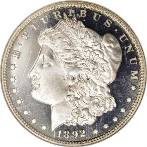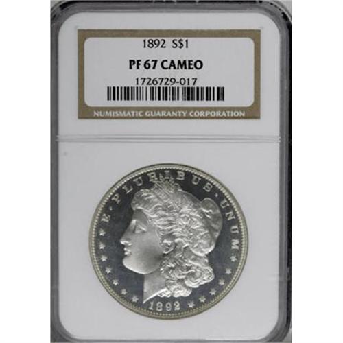 <B>1892 $1 PR67 Cameo NGC.</B></I> The 1892 proof dollars came from a relatively high mintage of 1,245 pieces. According to David Bowers, writing in his Silver and Trade dollars reference book (1993), this is explained by "... their inclusion in 1892 silver Proof sets, which were in special demand due to the new Barber designs for the dime, quarter, and half dollar."<BR> Wisps of light tan-gold color gravitate to the obverse rim, and extend slightly into the fields on the reverse. The frosted devices yield stunning contrast with the deeply mirrored fields. The design elements are sharply struck, except for the usual weakness in the centers. In this regard, Bowers says: "The situation of flatly struck Proof coins began in 1888. Dollars dated 1892 continue the trend and show lightness of strike above Miss Liberty's ear ... and on the eagle's breast feathers." Immaculately preserved surfaces do not even display a pedigree marker. Census: 15 in 67 Cameo, 3 finer (7/07).<BR><BR><BR><b>Shipping:</b> Coins & Currency (<a target="_blank" href="http://www.heritageauctions.com/common/shipping.php">view shipping information</a>\)