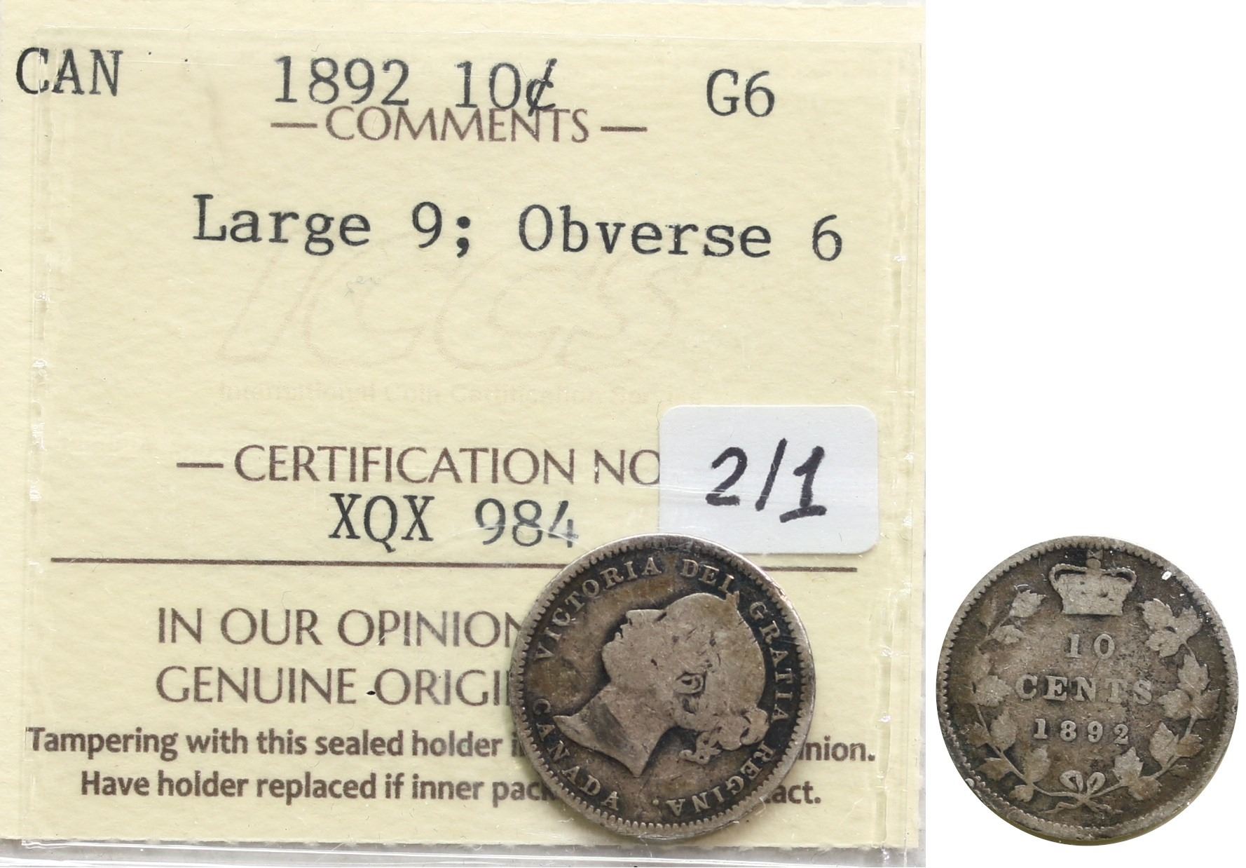 1892 10¢ "Large 9, 2/1 - Obv.6" ICCS Good-6. Scarcer variety.
