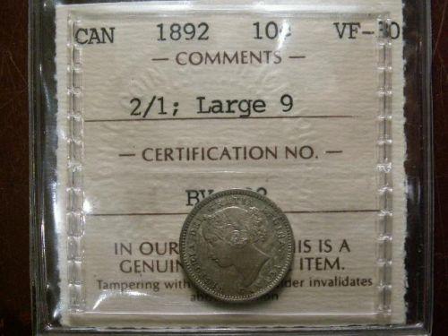 1892 10¢ Large 9, 2/1 variety ICCS VF30. Rare variety and underrated.