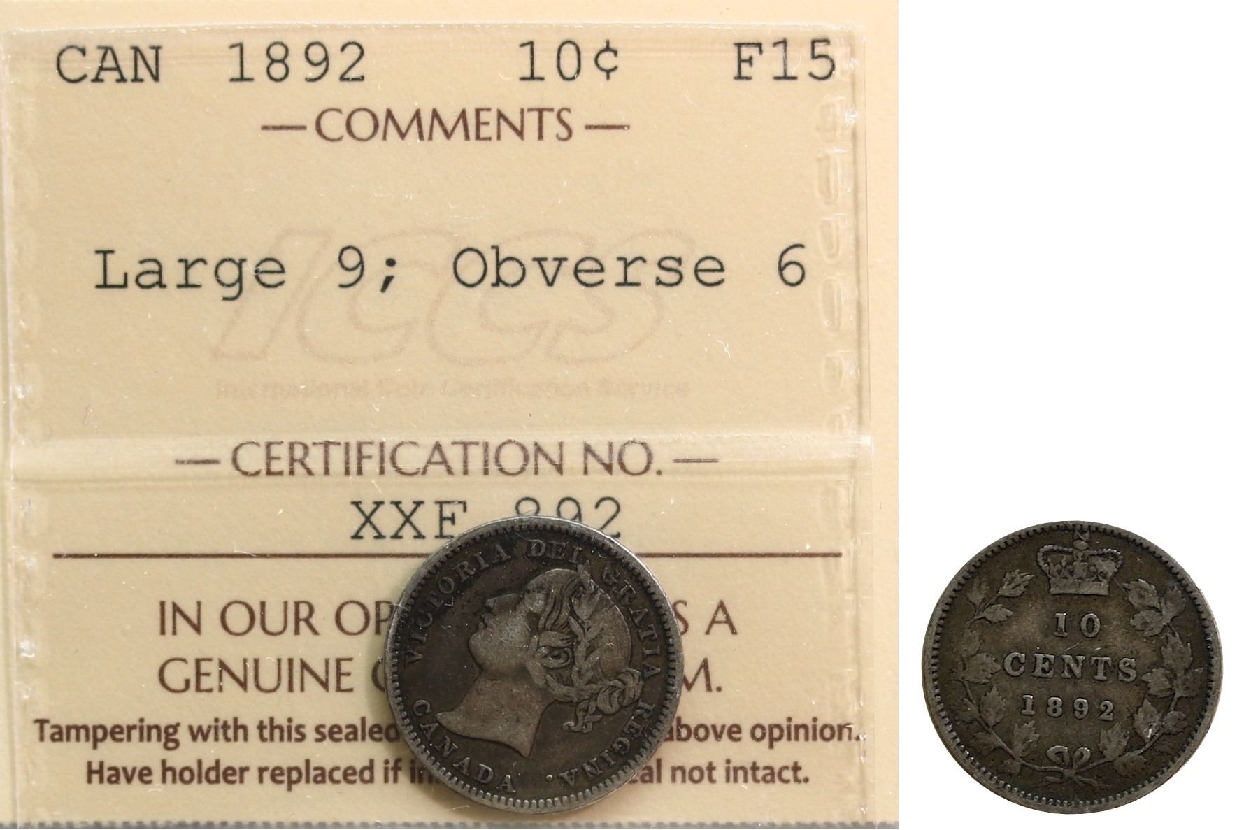 1892 10¢ "Large 9; Obv.6" ICCS Choice Fine-15. Scarce variety!