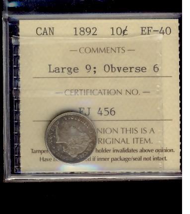 1892 10¢ Lg 9, Obv 6 ICCS EF40.