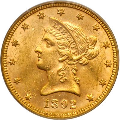 1892 $10 Liberty. PCGS graded MS-60. Housed in an Old Green Holder. Pinkish gold in color with some warmer shades. Frosty (PCGS # 8721) .