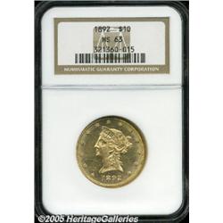 <B>1892 $10 MS63 NGC.</B></I> Brassy-gold surfaces possess fields that are nearly prooflike, nicely setting off the sharply struck design elements. Numerous, tiny contact marks are visible over each side.