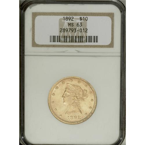 <B>1892 $10 MS63 NGC.</B></I> Frosty and lightly abraded with wheat-gold and peach-gold swirls in the fields. The luster is strong, and Liberty's features have suitable detail.<BR><BR><b>Shipping:</b> Coin/Currency (<a target="_blank" href="http://www.heritageauctions.com/common/shipping.php">view shipping information</a>)