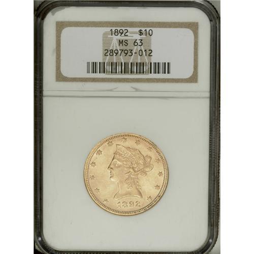 <B>1892 $10 MS63 NGC.</B></I> Frosty and lightly abraded with wheat-gold and peach-gold swirls in the fields. The luster is strong, and Liberty's features have crisp detail.<BR><BR><b>Shipping:</b> Coin/Currency (<a target="_blank" href="http://www.heritageauctions.com/common/shipping.php">view shipping information</a>)