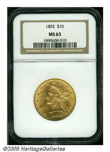 <B>1892<$10> MS63 NGC.</B></I> This sharply struck and fully lustrous type coin has just a few too many faint marks on the obverse field to achieve a Choice designation.