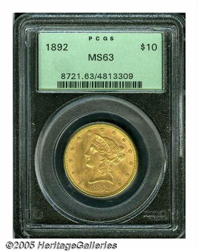 <B>1892<$10> MS63 PCGS.</B></I> A lustrous and original piece with pale peach color and a clean reverse. A few moderate marks accompany the obverse field. In an old green label holder.