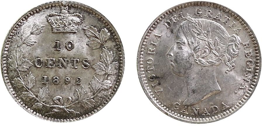1892 10¢ "Small 9 - Obv.5" ICCS Choice Mint State-64 Brilliant and lustrous with delicate russet tone.