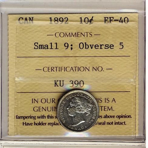 1892 10¢ Sml 9 Obv 5 ICCS EF40.