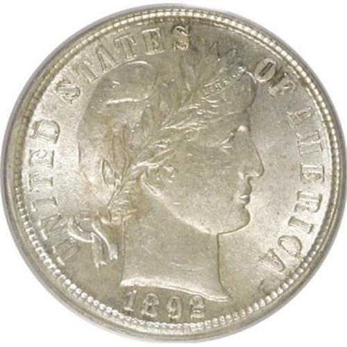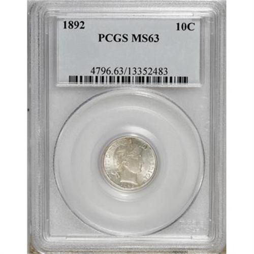 <B>1892 10C MS63 PCGS.</B></I> . PCGS Population (255/449). NGC Census: (223/527). Mintage: 12,121,245. Numismedia Wsl. Price for NGC/PCGS coin in MS63: $152. (#4796)<BR><BR><B>Coin Engraver:</B> Charles E. Barber<BR><BR><b>Shipping:</b> Coins & Currency (<a target="_blank" href="http://www.heritageauctions.com/common/shipping.php">view shipping information</a>)