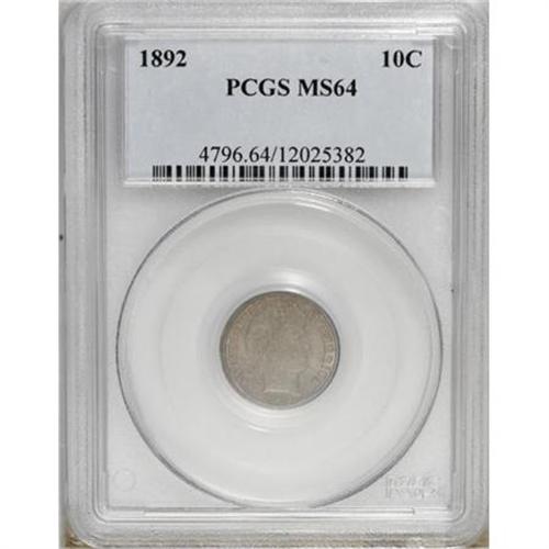 <B>1892 10C MS64 PCGS.</B></I> PCGS Population (252/192). NGC Census: (299/227). Mintage: 12,121,245. Numismedia Wsl. Price for NGC/PCGS coin in MS64: $260. (#4796)<BR><BR><B>Coin Engraver:</B> Charles E. Barber<BR><BR><b>Shipping:</b> Coins & Currency (<a target="_blank" href="http://www.heritageauctions.com/common/shipping.php">view shipping information</a>)