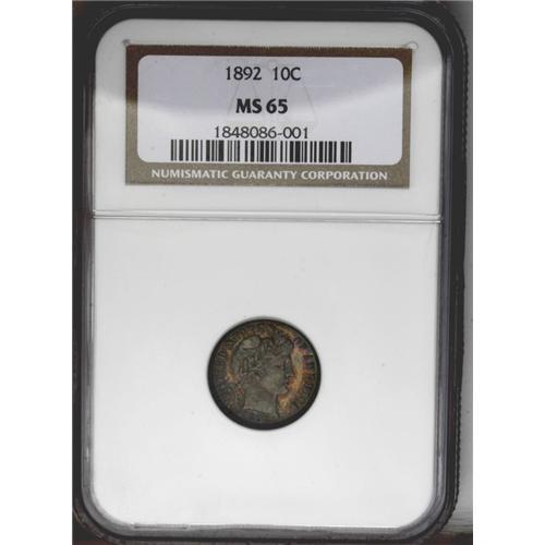 <B>1892<10C> MS65 NGC.</B></I> Slightly reflective surfaces have sparkling red, orange, and blue toning. A sharply struck Gem first-of-type specimen.<BR><I>Ex: Stack's, 7/52, lot 329.</B></I><BR><I>From The Redfjord Collection.</B></I>
