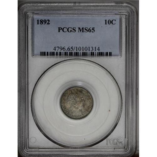 1892 10C MS65 PCGS. This is a wonderful Gem quality ex 1892[10C] MS65 PCGS.