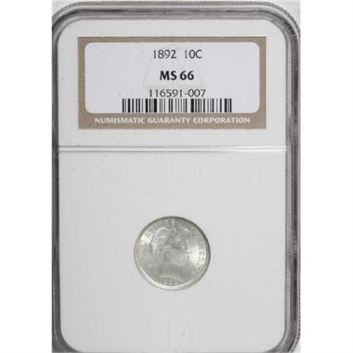 <B>1892 10C MS66 NGC.</B></I> Highly lustrous and fully defined with brilliant and frosty silver surfaces. Heavy clash marks on both sides lend additional collector appeal to this first year Barber dime. Census: 75 in 66, 23 finer (1/08).<BR><I>From The Southwest Collection.</B></I><BR><BR><B>Coin Engraver:</B> Charles E. Barber<BR><BR><b>Shipping:</b> Coins & Currency (<a target="_blank" href="http://www.heritageauctions.com/common/shipping.php">view shipping information</a>)