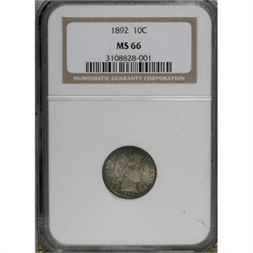 <B>1892 10C MS66 NGC.</B></I> This sumptuously toned and exquisitely preserved Premium Gem showcases beautiful, satiny luster. Violet, lavender, and olive-gold shadings grace the obverse, while the reverse adds gunmetal-blue to the mix. Census: 75 in 66, 23 finer (1/08).<BR><BR><B>Coin Engraver:</B> Charles E. Barber<BR><BR><b>Shipping:</b> Coins & Currency (<a target="_blank" href="http://www.heritageauctions.com/common/shipping.php">view shipping information</a>)