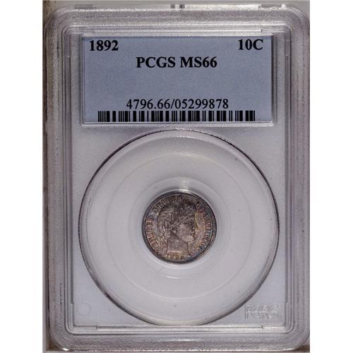 1892 10C MS66 PCGS. Fire-red, sea-green, olive-gray, a 1892[10C] MS66 PCGS.