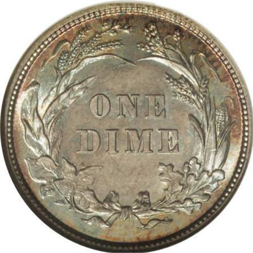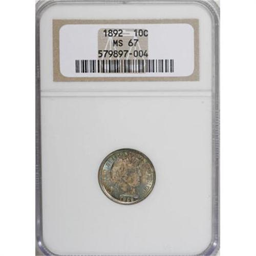 <B>1892 10C MS67 NGC.</B></I> Dazzling luster sweeps across this lavishly toned aquamarine and rose-red Superb Gem. The obverse has a series of interesting rim die breaks between 3 and 5 o'clock. Pristine aside from an unimportant graze above the left ribbon loop. Census: 22 in 67, 0 finer (6/07).<BR><I>From The Belle Glade Collection, Part Two.</B></I><BR><BR><B>Coin Engraver:</B> Charles E. Barber<BR><BR><b>Shipping:</b> Coins & Currency (<a target="_blank" href="http://www.heritageauctions.com/common/shipping.php">view shipping information</a>\)