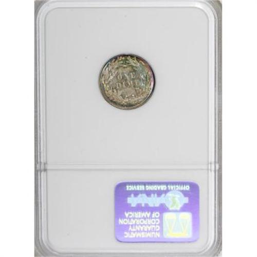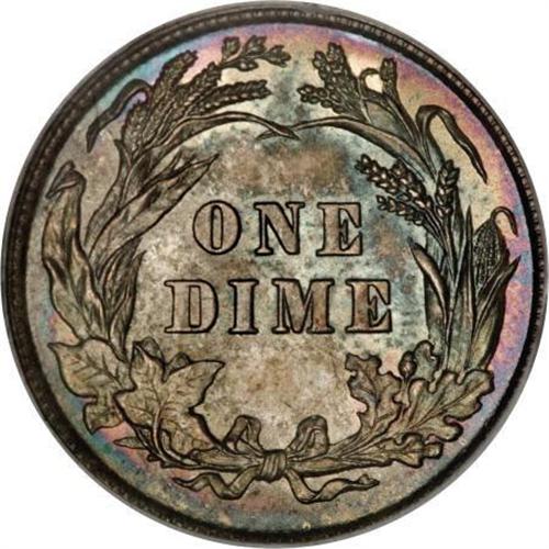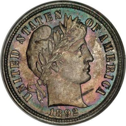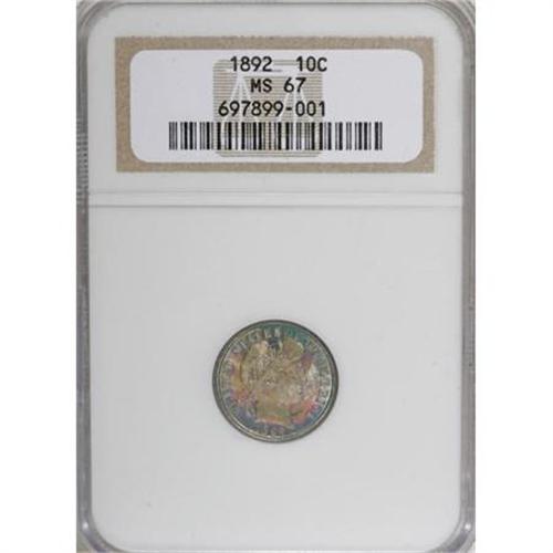 <B>1892 10C MS67 NGC.</B></I> Coins in MS67 are generally attractive, but this important and widely collected first year of issue has enchanting, deep, multicolored toning with rich garnet, sapphire, and tanzanite colors over each side. The beautiful toning distinguishes it from its few Superb peers. Plentiful mint frost further ignite the surfaces of this well-preserved Superb dime. For pedigree purposes, a charcoal toning streak is seen between Liberty's neck and the final A of AMERICA. Census: 23 in 67, 0 finer (11/07).<BR><BR><B>Coin Engraver:</B> Charles E. Barber<BR><BR><b>Shipping:</b> Coins & Currency (<a target="_blank" href="http://www.heritageauctions.com/common/shipping.php">view shipping information</a>)