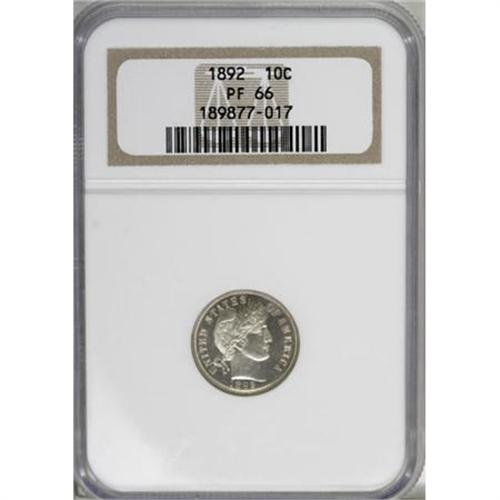 <B>1892 10C PR66 NGC.</B></I> Hints of faint gold toning accent the delightful cameo appearance of this Premium Gem proof. Census: 50 in 66, 18 finer (1/08).<BR><I>From The Southwest Collection.</B></I><BR><BR><B>Coin Engraver:</B> Charles E. Barber<BR><BR><b>Shipping:</b> Coins & Currency (<a target="_blank" href="http://www.heritageauctions.com/common/shipping.php">view shipping information</a>)