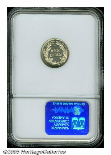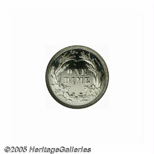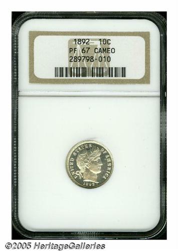 <B>1892<10C> PR67 Cameo NGC.</B></I> A brilliant and sharply struck Superb Gem that has excellent contrast between the devices and the fields. A beautiful and supremely preserved example from the first year of the series. There are a couple of tiny planchet flaws (as struck), and few scattered toning specks on the otherwise fully untoned, seemingly pristine proof surfaces. Population: 10 in 67 Cameo, 1 in 66 Ultra Cameo (6/05).