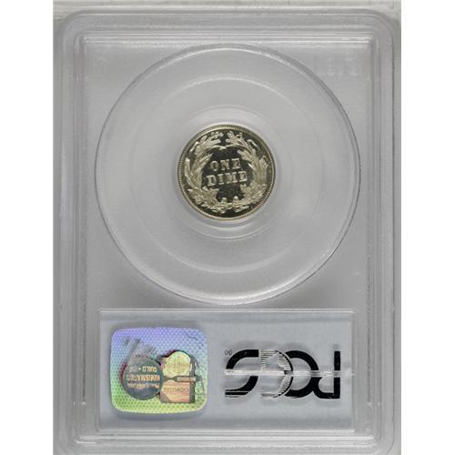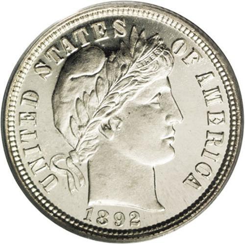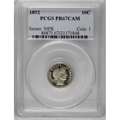 <B>1892<10C> PR67 Cameo PCGS.</B></I> This beautiful cameo has fantastic contrast between the deeply mirrored fields and frosty motifs. The surfaces are virtually devoid of any notable contact marks, and show just a touch of tan color on Liberty's cap. The design features are exquisitely struck, with crisp definition apparent on all of the devices. PCGS and NGC combined report only 12 specimens at this grade level, with two pieces graded higher. A rare opportunity for the Barber dime specialist to acquire a near-perfect 1892 cameo. Population: 4 in 67, 2 finer (5/06).