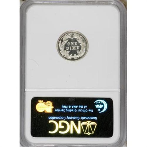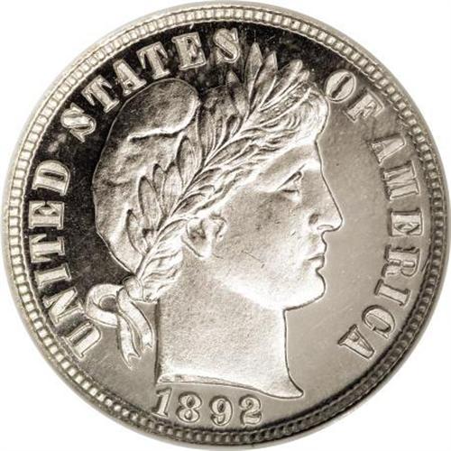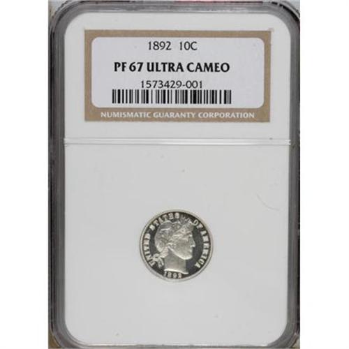 <B>1892 10C PR67 Ultra Cameo NGC.</B></I> The first-year 1892 Barber proof coinage of 1,245 pieces was more than double 1891's 600 coins, but contemporary enthusiasm for the series was short-lived. An excerpt from <I>The Numismatist</B></I> reviewing the new Barber designs reads, in part, "These pieces have, by this time, been in the hands of our readers. The mechanical work is all that could be desired, and it is probable, that owing to the conventional rut in which our Mint authorities seem obliged to keep, that it is the best that could be done,--for after all they are not gotten up for the collector, but for general barter,--but to the numismatist or lover of the beautiful in design and art, they will be but another disappointment, hardly noticeable sic now because expected, and we are getting so used to them." The proof mintage plummeted in 1893 to 792 pieces, a near-40% drop.<BR> The present example is an essential type coin, at PR67 Ultra Cameo the only coin so graded at NGC (5/07). Both sides feature deep black-on-silver contrast between the fields and devices, with no hint of toning. A small contact mark is noted on Liberty's cheek.<BR><BR><b>Shipping:</b> Coins & Currency (<a target="_blank" href="http://www.heritageauctions.com/common/shipping.php">view shipping information</a>)