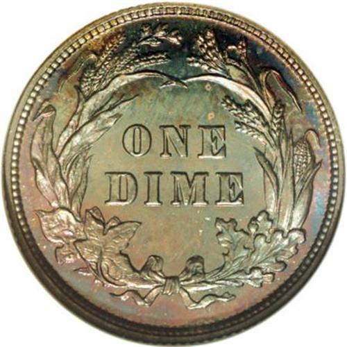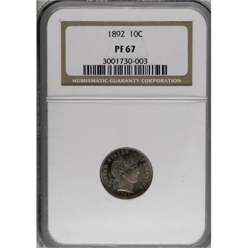 <B>1892 10C PR67 NGC.</B></I> 1,245 proof dimes were made in 1892, the highest proof mintage of the Barber dime series. NGC and PCGS have certified close to 500 examples to date, primarily in the PR63 to PR65 range. This PR67 example displays mild field-motif contrast when the coin is tilted under a light source. A well executed strike emboldens the design elements, and medium-toned aqua-blue and lilac patination enrich well preserved surfaces. Census: 18 in 67, 0 finer (6/07).<BR><BR><B>Coin Engraver:</B> Charles E. Barber<BR><BR><b>Shipping:</b> Coins & Currency (<a target="_blank" href="http://www.heritageauctions.com/common/shipping.php">view shipping information</a>\)