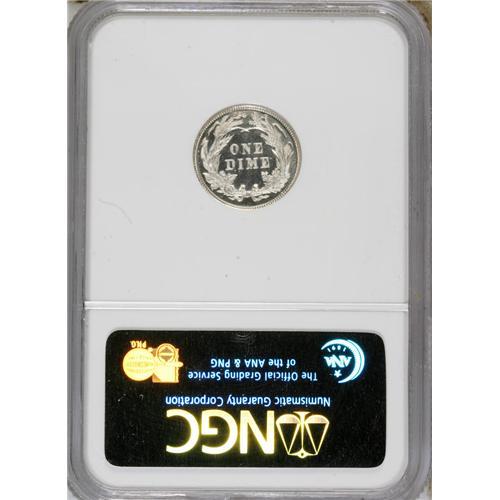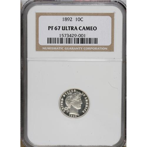 <B>1892 10C PR67 Ultra Cameo NGC.</B></I> Mintages of proof Barber coins soared--relatively speaking--from the last year of the Seated Liberty coinage in 1891, a series that must have seemed interminable to collectors of the time. Indeed, many U.S. residents in the mid-19th century lived and died without ever seeing another silver coin design than the Seated Liberty. The first-year 1892 Barber proof coinage of 1,245 pieces was more than double 1891's 600 coins, but enthusiasm for the series was short-lived, if it existed at all. A contemporaneous excerpt from <I>The Numismatist</B></I> reviewing the new Barber designs reads, in part, "These pieces have, by this time, been in the hands of our readers. The mechanical work is all that could be desired, and it is probable, that owing to the conventional rut in which our Mint authorities seem obliged to keep, that it is the best that could be done,--for after all they are not gotten up for the collector, but for general barter,--but to the numismatist or lover of the beautiful in design and art, they will be but another disappointment, hardly noticable sic now because expected, and we are getting so used to them." The proof mintage plummeted in 1893 to 792 pieces, a near-40% drop.<BR> The present example is an essential type coin, at PR67 Ultra Cameo the only coin so graded at NGC (3/07). Both sides feature deep black-on-silver contrast between the fields and devices, with no hint of toning. A small contact mark is noted on Liberty's cheek.<BR><BR><b>Shipping:</b> Coins & Currency (<a target="_blank" href="http://www.heritageauctions.com/common/shipping.php">view shipping information</a>)