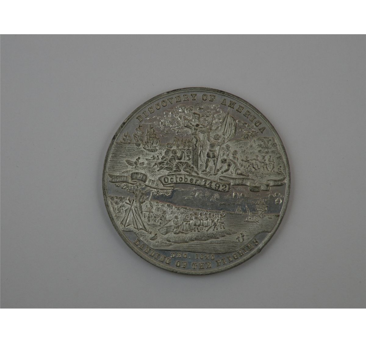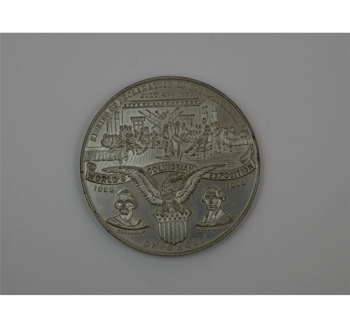 1892- 1893 Columbian Exposition Medal. White Metal, 58mm. Signing of Declaration/ Discovery of America and Landing of Pilgrims. Eglit- 36A. Br. Unc, prooflike. Est.$75