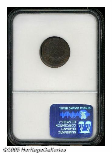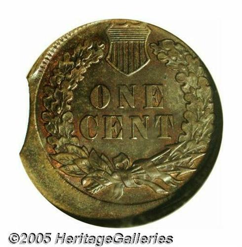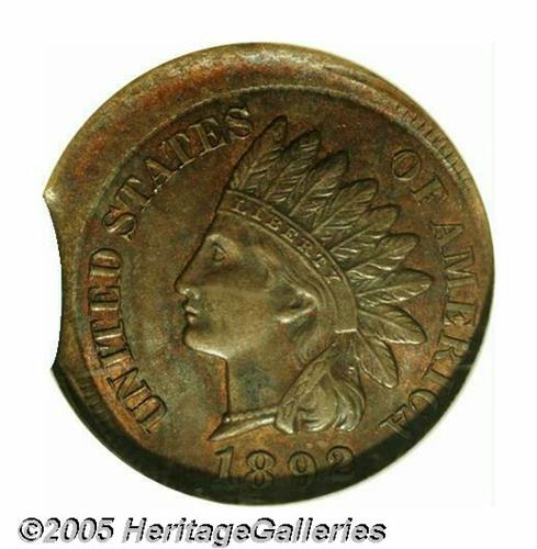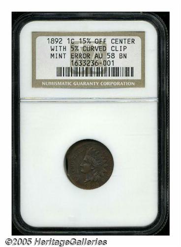 <B>1892<1C> Indian Cent--Off Center With 5% Curved Clip--AU58 NGC.</B></I> Extra flan is seen on the left portion of each side and it is also on that side that the 5% clip is located. Reddish-brown coloration and sharply struck.